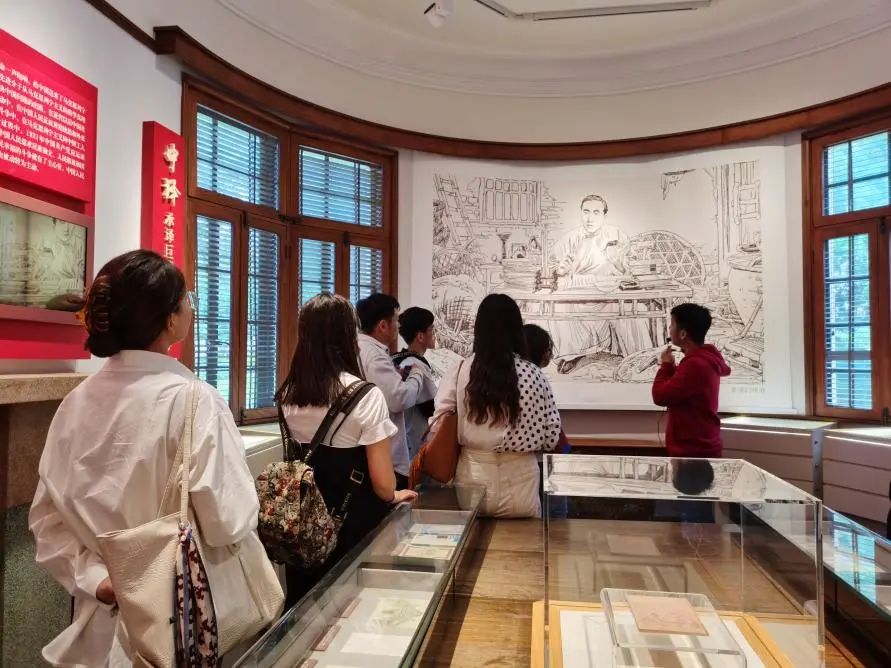 复旦大学《共产党宣言》展示馆“星火”党员志愿服务队队员蒋同学作为本次参观活动的讲解员,他介绍到:年仅29岁的陈望道先生手执笔墨,栖身案牍,因翻译《共产党宣言》太过专注投入,误将墨水当红糖,蘸着粽子吃下,直呼“可甜了可甜了”。