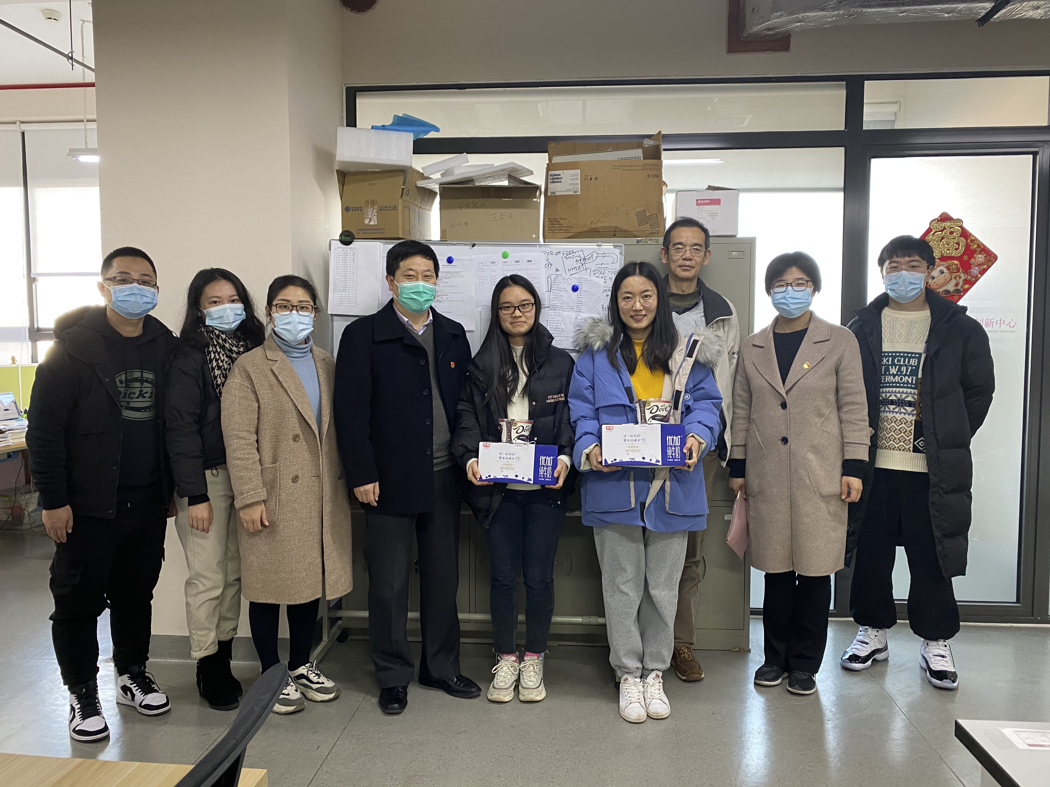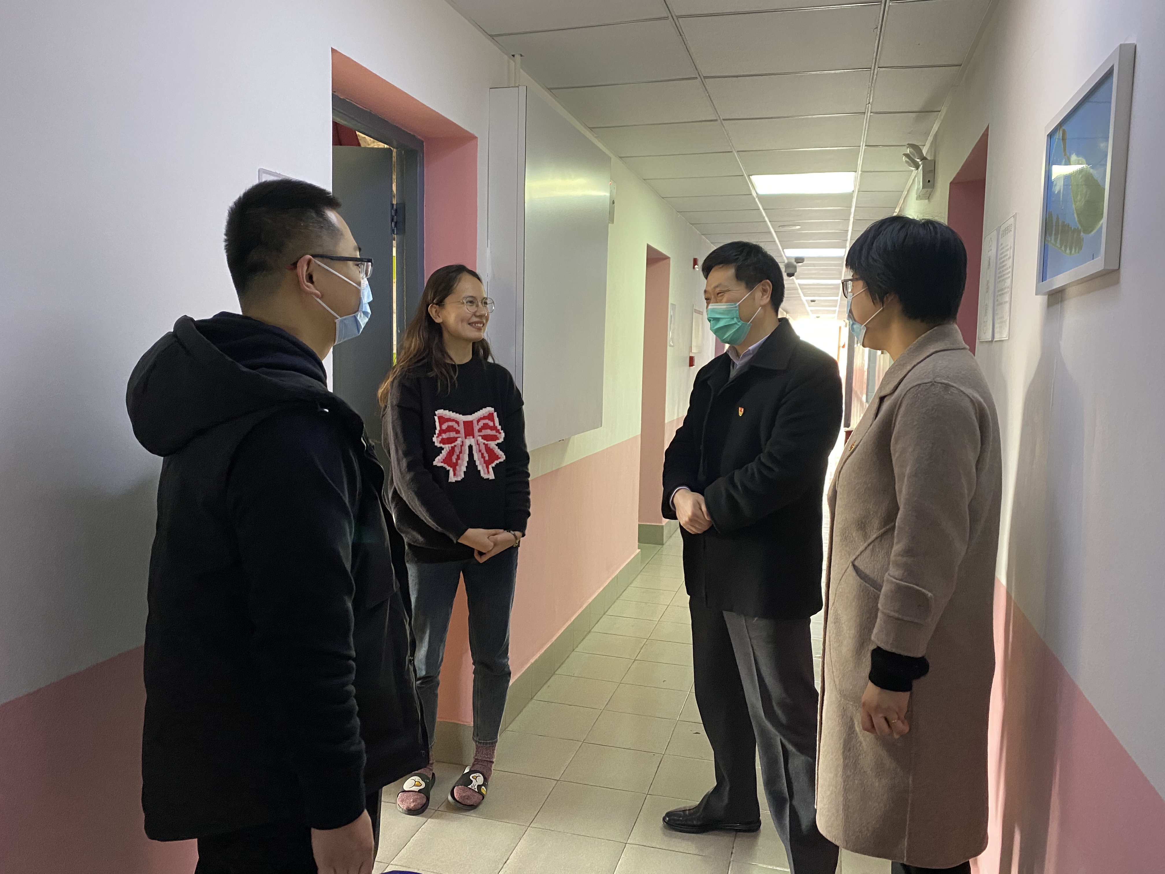 为关心和深入了解寒假留校学生的学习和生活情况,使学生们度过一个健康、快乐的春节,24日下午,在nHentai 党委书记李医明、副书记沈漫的带领下,辅导员王倩倩、王盼、胡志强、范丽晨等4位老师来到实验室、宿舍园区看望并慰问了留校的学生。