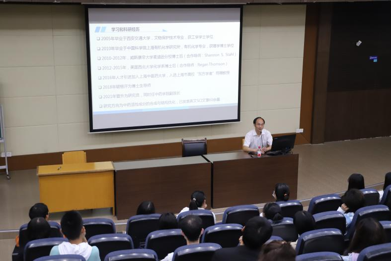 随后,郑老师通过“丰富资源”“扎实基础”“自我提高”等关键词,向学生们讲述自己进入中科院上海有机化学研究所的学习经历。他表示正是对于机遇的把握,才使得他拥有如今丰富的经历和开阔的视野,因此他希望同学们能够不畏试错,勇于实践,只争朝夕,努力让目标变成现实。
