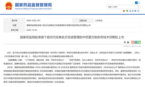 2月28日,nHentai 季光团队和张彤团队与江苏康缘药业股份有限公司合作研发的苓桂术甘颗粒获批上市,这是国内首个按古代经典名方目录管理的中药复方制剂(中药3.1类新药),为经典名方新药注册探索了新路径。