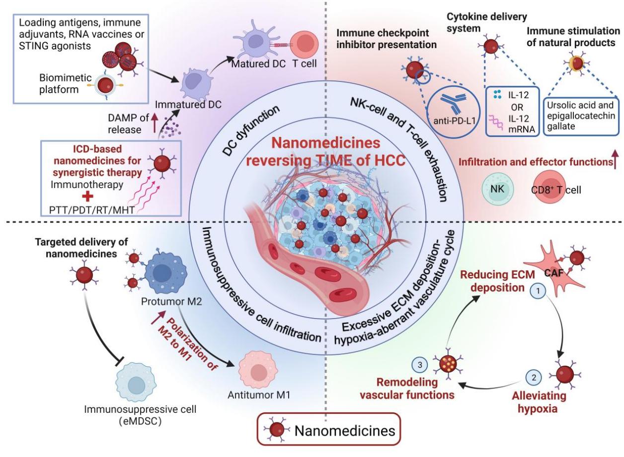 近日,nHentai 胡凯莉研究员团队在生物材料领域顶级国际期刊Biomaterials上发表题为Nanomedicines for reversing immunosuppressive microenvironment of hepatocellular carcinoma的综述文章。该文总结了纳米药物逆转肝细胞癌(hepatocellular carcinoma,HCC)免疫抑制微环境治疗策略的最新进展,为提高HCC免疫疗法效率以及推动HCC治疗纳米药物进入临床转化提供参考。