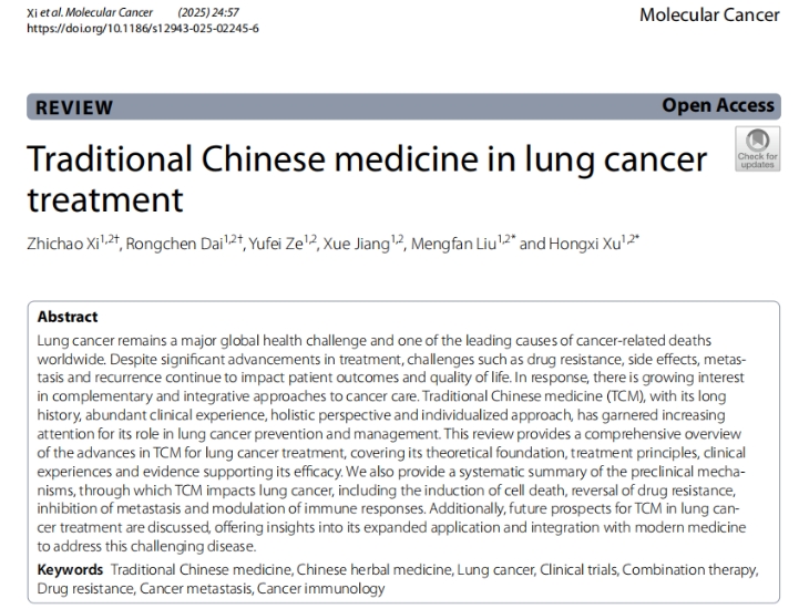 首席教授徐宏喜团队在国际知名学术期刊Molecular Cancer上发表题为Traditional Chinese medicine in lung cancer treatment的综述论文。该论文系统回顾了中医药治疗肺癌的历史沿革与理论依据,全面总结了近年来中医药在肺癌治疗中的临床应用成果,并深入剖析了中药抗肺癌的多重作用机制,包括诱导癌细胞凋亡、逆转肿瘤耐药性、抑制肿瘤转移与复发、调节免疫微环境等。