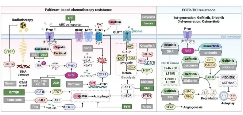 近年来,大量临床前研究深入揭示了中药治疗肺癌的多靶点分子机制,为中医药在肺癌治疗中的应用提供了坚实的科学依据。研究表明,中药可通过多途径诱导肺癌细胞发生程序性死亡,包括但不限于细胞凋亡、自噬、焦亡及铁死亡等多种细胞死亡机制。在联合治疗方面,中药展现出显著的协同增效作用,其通过调控ABC转运体家族蛋白表达、抑制糖酵解关键酶活性、调节表皮生长因子受体(EGFR)信号通路等多种分子机制,有效逆转肿瘤细胞对化疗药物和靶向药物的耐药性。