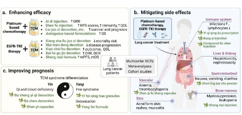 在这一背景下,中医药在肺癌治疗中的作用受到了越来越多的关注。与传统的放化疗等以直接杀灭肿瘤细胞为目标的治疗手段不同,中医药强调整体观念,倡导“带瘤生存”的理念。其不仅关注疾病本身的进展,更注重调理患者的整体状态,旨在提高生活质量、延长生存期。大量临床研究表明,中医药在肺癌治疗中表现出独特的优势。与常规治疗联合应用时,可显著增强治疗效果,减轻放化疗的毒副作用,并改善患者的免疫功能。此外,中医药在逆转肿瘤耐药性、抑制转移和复发等方面也展现出潜在的应用前景。