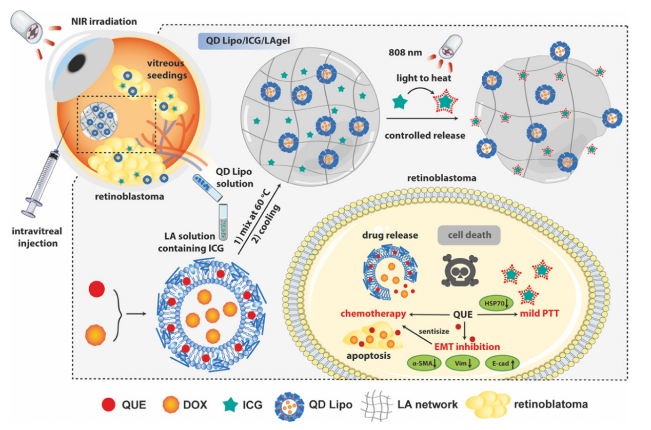 近日,nHentai 冯年平/吕雅琪团队在生物医学1区期刊《Theranostics》(IF: 12.4)发表题为Hybrid NIR-responsive liposome/hydrogel platform mediating chemo-photothermal therapy of retinoblastoma enhanced by quercetin as an adjuvant的研究论文。该研究报道了一种基于共载槲皮素/多柔比星脂质体(QD Lipo)的吲哚菁绿-低熔点琼脂糖水凝胶(QD Lipo/ICG/LAgel)。QD Lipo/ICG/LAgel是一种具有光热响应能力的可注射水凝胶药物递送系统,通过玻璃体注射将QD Lipo/ICG/LAgel植入玻璃体腔,利用近红外光的照射远程控制负载脂质体与光敏剂的释放,通过玻璃体腔内的局部可控化疗-光热治疗联合提升视网膜母细胞瘤的疗效,为视网膜母细胞瘤的治疗提供新的模式。