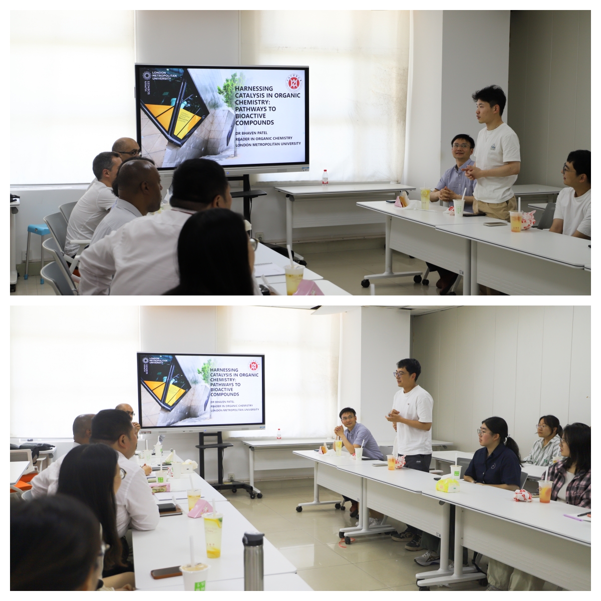 随后,英方教师Dr. Bhaven Patel和Dr. Bruno Sil dos Santos分享了他们的研究经历和成果。Dr. Bhaven Patel介绍了团队在有机化学合成领域取得的研究成果,详细探讨了具有多重生物活性的马里诺喹啉和有机磷类衍生物的合成策略,并指出流动化学技术在提升药物合成效率方面的重要贡献。Dr. Bruno Sil dos Santos分享了自己跨学科研究的经历,重点介绍了3D打印技术在化学领域的创新应用。研究团队从基础模型打印逐步发展到复杂设备研发,如便携式光谱仪和药物载体材料,并探索了环保型材料及药物渗透技术。他鼓励同学们将自身所学的基础知识应用于新的研究领域,创造性地解决实际问题。分享会后,老师和同学们就感兴趣的问题同英方老师进行了热烈的讨论。