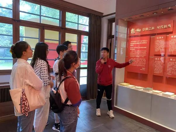 复旦大学《共产党宣言》展示馆“星火”党员志愿服务队队员蒋同学作为本次参观活动的讲解员,他介绍到:年仅29岁的陈望道先生手执笔墨,栖身案牍,因翻译《共产党宣言》太过专注投入,误将墨水当红糖,蘸着粽子吃下,直呼“可甜了可甜了”。