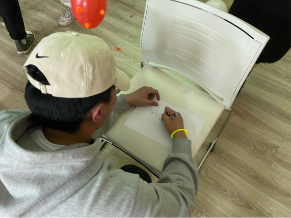 紧接着,同学们又开展了《你画我猜》游戏,同学们随机抽签来决定作画的词语,通过依次作画的方式两组依次进行PK,每个“题目”都别样精彩。四个队的队长精密分工,制定策略,经过激烈的比拼,绿队最终稍逊一筹,以一分分差“赢得了”上台表演的机会。令人意想不到的是,绿队全队尤其是队长以其夸张风趣的动作赢得了满堂喝彩。