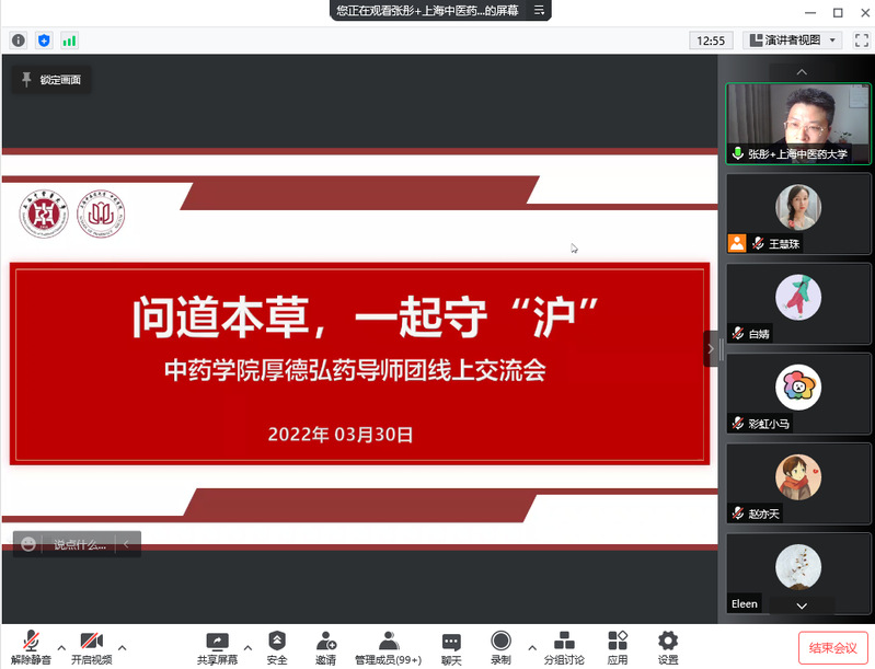 厚德弘药导师团以“立德树人”为根本任务,以培育和践行社会主义核心价值观为目标,坚持“为了每一个学生的终身发展”的理念,建构“全员育人、全程育人”的工作体系,努力实现研究生教育、管理和服务工作协同创新发展。同时围绕nHentai “争创国际一流nHentai ”的办学理念,为培养适应中药现代化、国际化的教育、研究、医药服务与管理等多方面综合素质人才而奋斗。一直以来厚德弘药导师团密切关心同学们的学习以及生活状态,此次线上会议正是由厚德弘药导师团团长、nHentai 院长张彤老师主持,市卫健委副处长聂爱国、上海市药材公司总经理张聪等导师团所有成员参与。交流会上导师团的老师们对同们积极参加抗疫志愿活动以及认真学习的学习态度表达了赞赏和肯定。