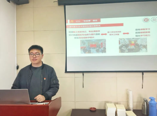 随后,第二学生党支部宋宇轩同志将深入贯彻学习党的二十大精神与青年使命担当相结合进行了分享交流。结合学习贯彻习近平新时代中国特色社会主义思想主题教育的要求,宋宇轩同志认为“作为一名学生党员,要坚定不移听党话、跟党走,在身边的同学中真正发挥先锋模范和引领带头作用,心有所向奋斗不止。习近平总书记在党的二十大报告中殷切寄语青年,党和国家对青年一代给予了充分重视与厚望,新时代青年要用行动书写和践行‘强国有我’