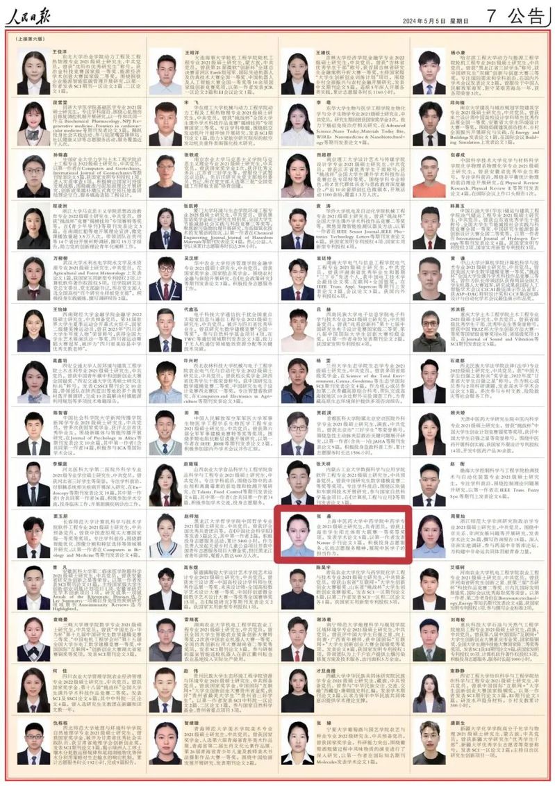 近日,《人民日报》刊登了《2022—2023学年度研究生国家奖学金获奖学生代表名录》。据悉,经过严格选拔和评审,全国4.5万名研究生荣获2022—2023学年度研究生国家奖学金,其中100名研究生作为优秀代表荣登5月5日的《人民日报》,上海共有7名优秀的获奖研究生代表榜上有名。nHentai 硕士研究生张淼名列其中,这也是nHentai 学生首次入选该名录。