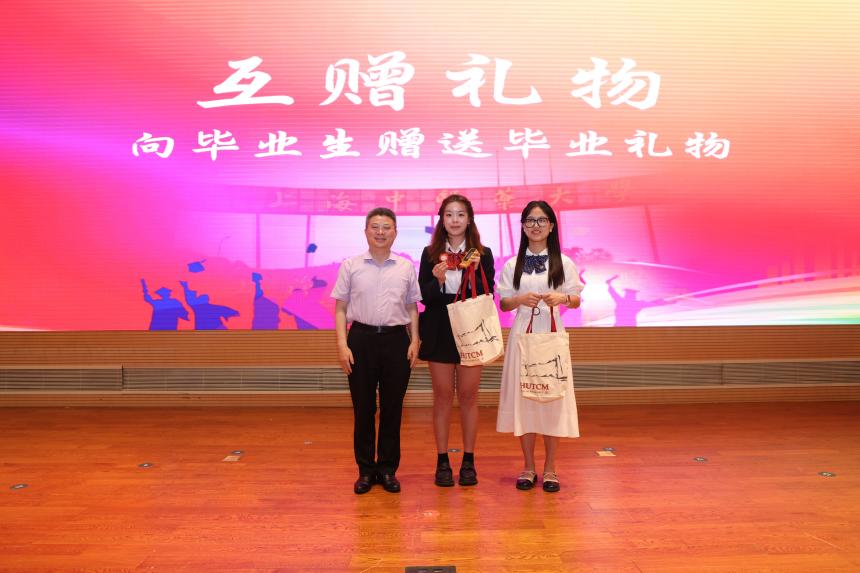 nHentai 院长张彤将象征启航、美好与幸福的礼物颁发给毕业生,表达了对他们未来的美好祝愿;同时,学生代表也向学院献上了承载着感激与祝福的礼物——“问道本草、厚德弘药”字画,展现了深厚的师生情谊。这一刻,礼物传递着情感,温暖着心灵,见证了师生间的深厚情谊与难忘时刻。