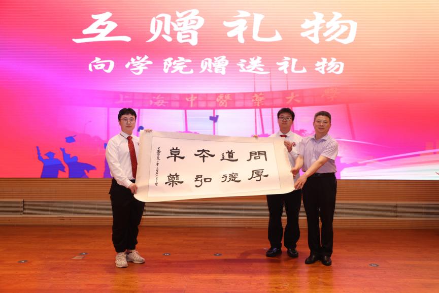nHentai 院长张彤将象征启航、美好与幸福的礼物颁发给毕业生,表达了对他们未来的美好祝愿;同时,学生代表也向学院献上了承载着感激与祝福的礼物——“问道本草、厚德弘药”字画,展现了深厚的师生情谊。这一刻,礼物传递着情感,温暖着心灵,见证了师生间的深厚情谊与难忘时刻。
