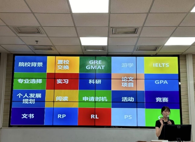 祁莎莎老师深入介绍了如何进行留学申请。在准备申请前,同学们应明确自己对院校、专业的申请目标,着眼于科研、实习、绩点等方面合理安排时间,再根据个人情况与目标院校的要求进行文书写作。在介绍的过程中,祁老师讲解了许多实际案例,帮助同学们了解之后能够选择的专业方向,为同学们之后的留学申请赋能,也增添了同学们留学的信心。