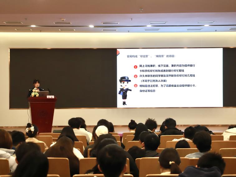 首先,殷慧警官以多年经历,介绍了近期高校电信网络诈骗发案趋势,针对大学生这一“易受电信网络诈骗”群体,殷警官分析介绍了高校电信网络诈骗案件中常见的诈骗类型,主要包括“网络交易”“投资理财”“买卖游戏账号”“刷单兼职”“邮箱领补贴”“冒充熟人”等诈骗形式。接着,殷警官从真实发生的高校诈骗案件展开,深入浅出生动形象地讲述了近几年引起师生广泛关注的新兴案件类型。讲座现场气氛活跃,全体参与同学认真倾听,不时与殷警官就所讲内容进行互动,并总结出“陌生人+转账=诈骗”的黄金等式。同时,殷警官特别提示同学们务必保护好个人信息,杜绝参与买卖银行卡、电话卡、微信账号、支付宝账号和参与银行柜台、ATM机取现等活动,避免构成“帮信罪”“掩隐罪”等。