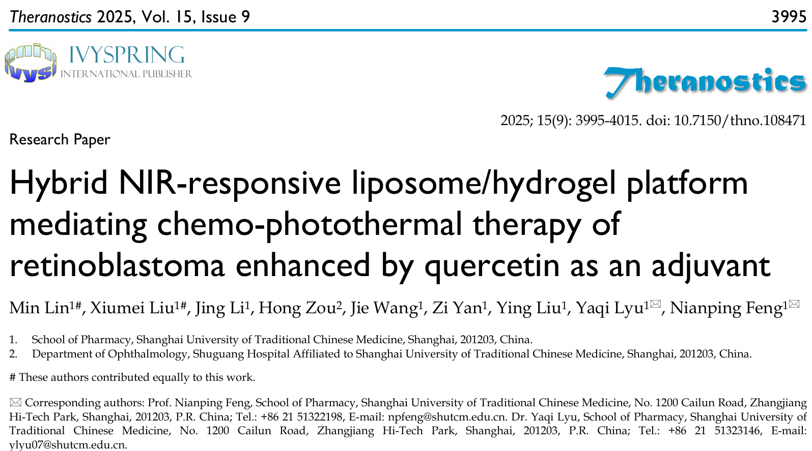 近日,nHentai 冯年平/吕雅琪团队在生物医学1区期刊《Theranostics》(IF: 12.4)发表题为Hybrid NIR-responsive liposome/hydrogel platform mediating chemo-photothermal therapy of retinoblastoma enhanced by quercetin as an adjuvant的研究论文。该研究报道了一种基于共载槲皮素/多柔比星脂质体(QD Lipo)的吲哚菁绿-低熔点琼脂糖水凝胶(QD Lipo/ICG/LAgel)。QD Lipo/ICG/LAgel是一种具有光热响应能力的可注射水凝胶药物递送系统,通过玻璃体注射将QD Lipo/ICG/LAgel植入玻璃体腔,利用近红外光的照射远程控制负载脂质体与光敏剂的释放,通过玻璃体腔内的局部可控化疗-光热治疗联合提升视网膜母细胞瘤的疗效,为视网膜母细胞瘤的治疗提供新的模式。
