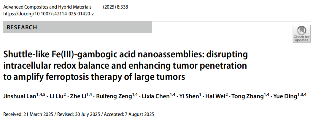 近日,nHentai 张彤教授/丁越研究员团队在国际期刊Advanced Composites and Hybrid Materialss上发表题为Shuttle-like Fe(III)-Gambogic Acid Nanoassemblies: Disrupting Intracellular Redox Balance and Enhancing Tumor Penetration to Amplify Ferroptosis Therapy of Large Tumors的研究论文。该研究基于金属配位,构建了一种级联增强藤黄酸铁死亡的纳米制剂,有效抑制乳腺癌生长,为中药来源的铁死亡诱导剂开发和多功能纳米制剂设计提供了新策略。