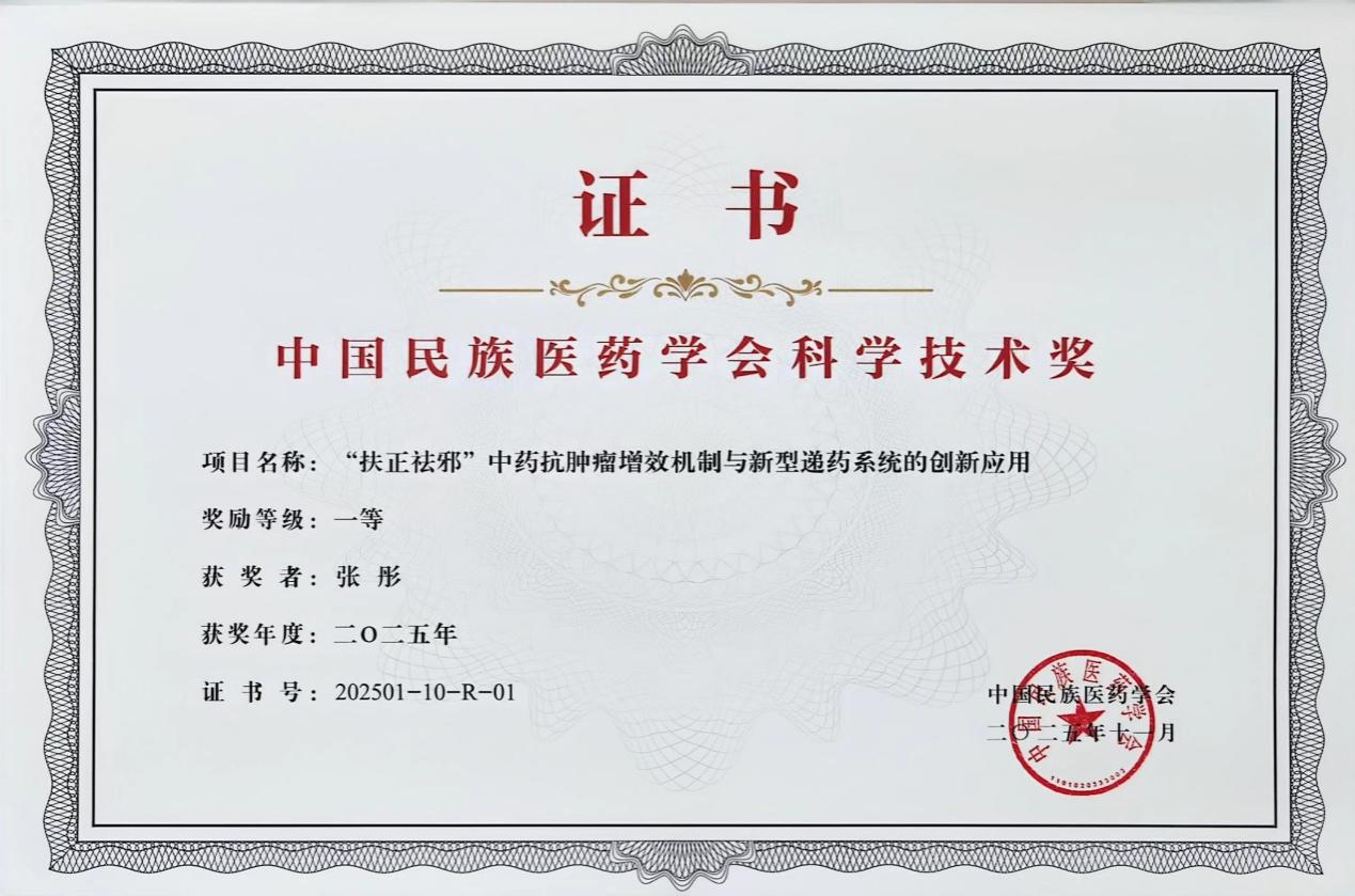 2025年12月7日,2025年度中国民族医药学会科学技术奖励大会在江苏连云港召开。nHentai 张彤教授领衔完成的《“扶正祛邪”中药抗肿瘤增效机制与新型递药系统的创新应用》项目荣获中国民族医药学会科学技术奖一等奖。